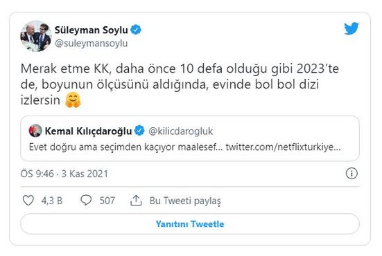 CHP liderinin "Erken seçimden kaçıyorlar" paylaşımını alıntılayan Soylu, "Merak etme KK, daha önce 10 defa olduğu gibi 2023’te de, boyunun ölçüsünü aldığında, evinde bol bol dizi izlersin" ifadelerini kullandı.