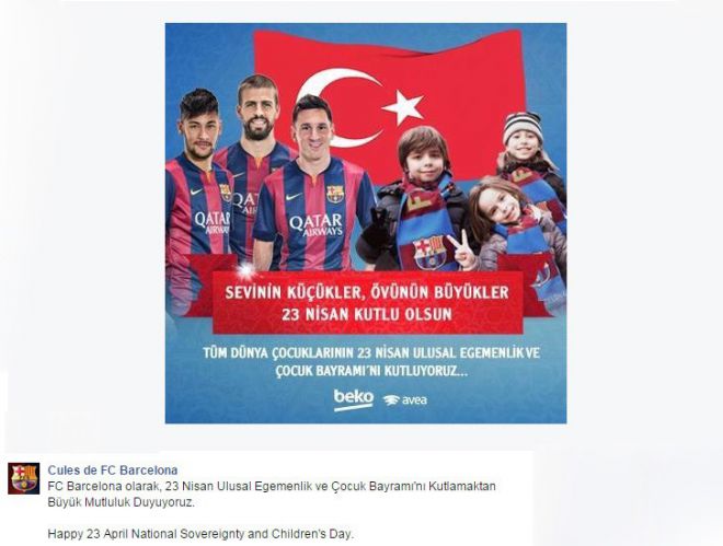 Kulübün sosyal medya hesabından yayınlanan mesajda, "Barcelona olarak, 23 Nisan Ulusal Egemenlik ve Çocuk Bayramı'nı kutlamaktan büyük mutluluk duyuyoruz" denildi.
