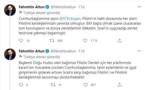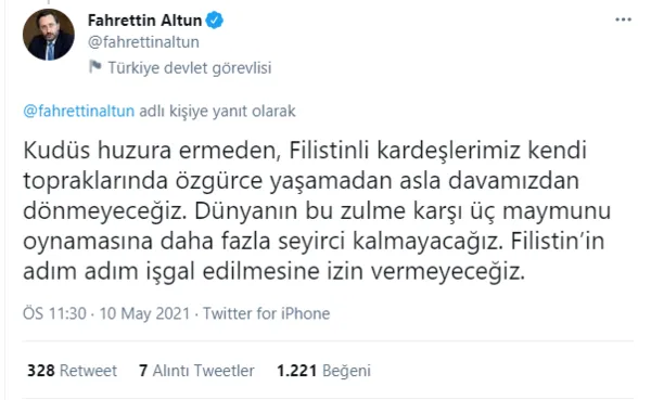 İletişim Başkanı Fahrettin Altun, İsrail'in Filistinlilere uyguladığı devlet terörünü bir kez daha sert ifadeler ile eleştirdi. Altun, Başkan Recep Tayyip Erdoğan'ın verdiği mücadeleye vurgu yaptı ve "Cumhurbaşkanımız sayın Recep Tayyip Erdoğan, Filistin'in haklı davasında her daim Filistinli kardeşlerimizin yanında olmuştur. BM başta olmak üzere uluslararası tüm kuruluşların ve dünya devletlerinin dikkatini, İsrail'in uyguladığı devlet terörüne çekmeyi başarmıştır" dedi.