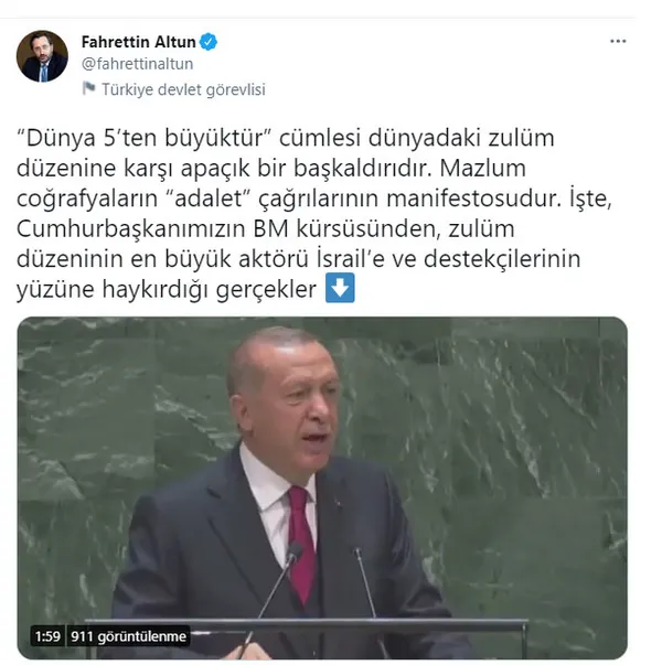 Sosyal medyada yaptığı paylaşımlarda Başkan Erdoğan'ın açıklamalarına da yer veren Altun "'Dünya 5'ten büyüktür' cümlesi dünyadaki zulüm düzenine karşı apaçık bir başkaldırıdır. Mazlum coğrafyaların "adalet" çağrılarının manifestosudur. İşte, Cumhurbaşkanımızın BM kürsüsünden, zulüm düzeninin en büyük aktörü İsrail'e ve destekçilerinin yüzüne haykırdığı gerçekler" dedi.