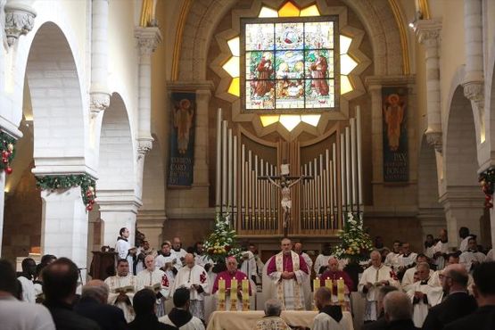 Kudüs Latin Patriği Başpiskopos Pierbattista Pizzaballa'nın yönettiği ayinde "Kudüs, Filistin devletinin başkentidir" temasına vurgu yapılırken, Filistin Devlet Başkanı Mahmud Abbas da katıldı.