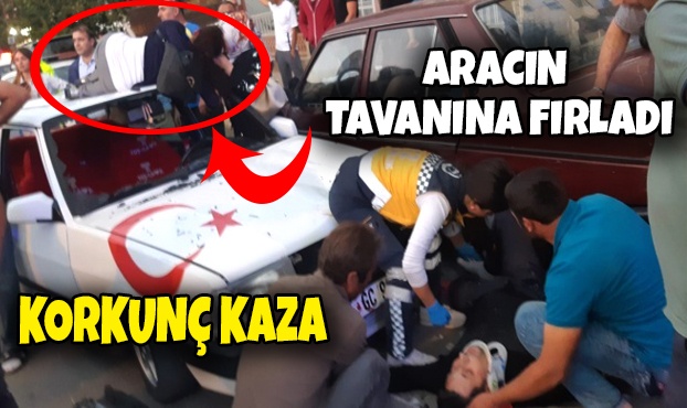 Bisikletteki kadın otomobilin tavanına uçtu