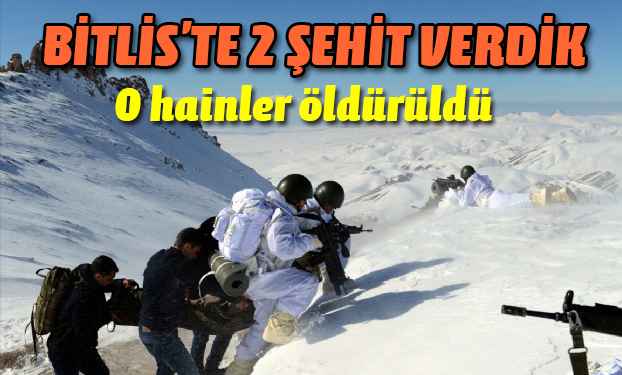 Bitlis'te meydana gelen çatışmada 2 asker şehit oldu..Bitlis'te devam eden terör operasyonlarından bugün acı haber geldi. PKK'lı teröristler ile meydana gelen çatışmada iki askerimiz şehit oldu, 2 askerimiz hafif şekilde yaralandı. Bölge de operasyonlar devam ediyor.