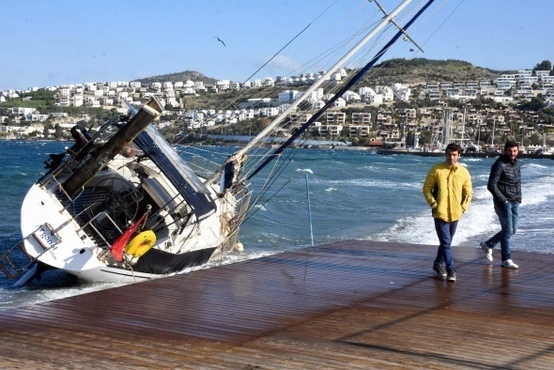 Muğla`nın Bodrum ilçesinde sabah saatlerinden itibaren etkisini arttıran fırtına nedeniyle balıkçı tekneleri batarken, yelkenli bir tekne karaya sürüklendi. Şiddetli fırtına nedeniyle Torba Mahallesi’nde bulunan dev reklam panosu da karayolu kenarına devrildi.