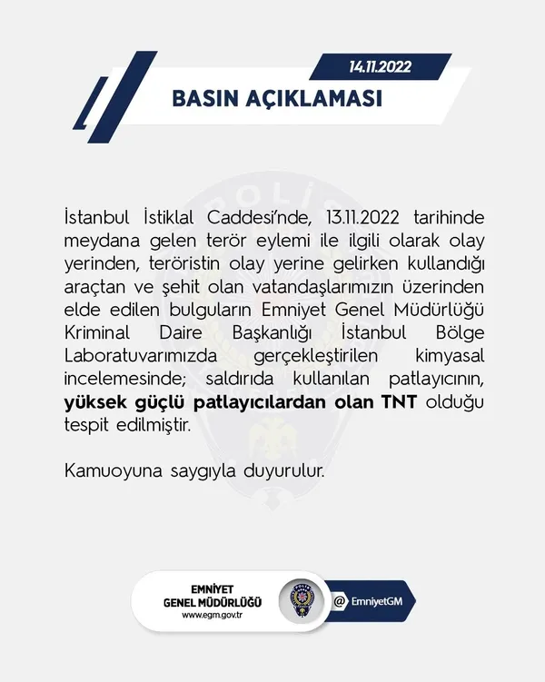 İstanbul Emniyet Müdürlüğü'nden yapılan yazılı basın açıklamasında Taksim'deki bombalı terör saldırısına ilişkin tüm detaylar paylaşıldı.