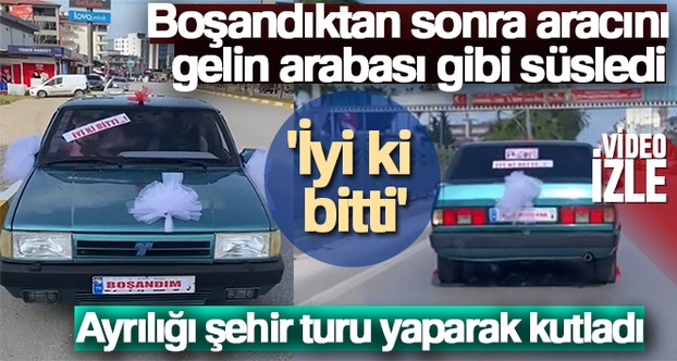 Antalya'nın Serik ilçesinde 6 yıllık eşiyle karşılıklı anlaşarak evliliğini sonlandıran Abdurrahman Akman, otomobilini gelin arabası gibi süsledi, şehir turu yaparak ayrılığını kutladı. Cep telefonu ile kaydettiği görüntüleri sosyal medyadan paylaştı.
