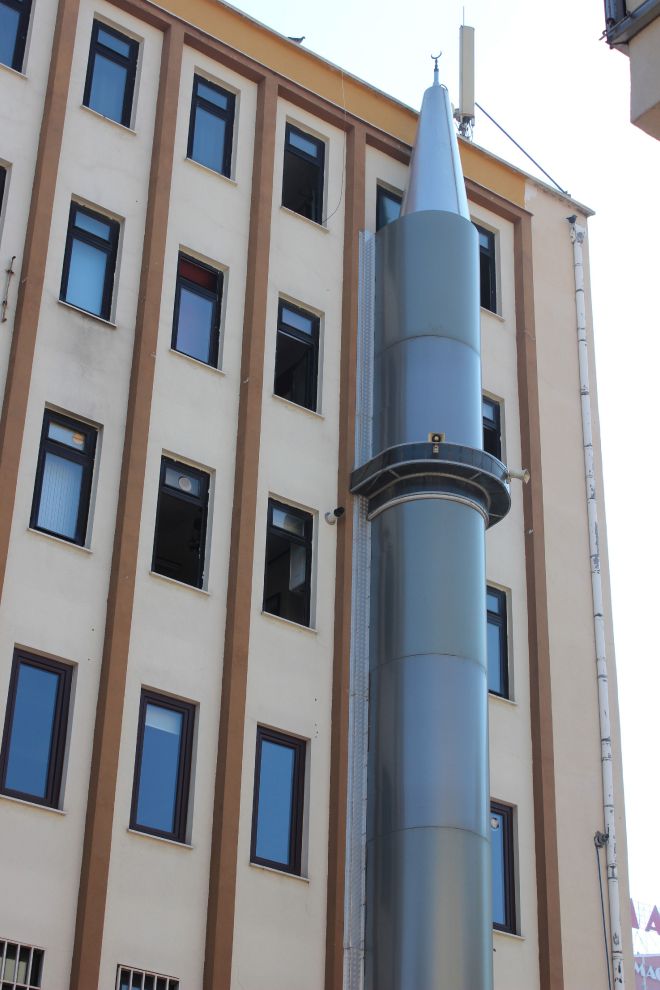 Kayseri’de bir iş merkezinin yangın merdiveni hem yangın merdiveni olarak hem de cami minaresi olarak kullanılıyor. 2011 yılında yaptırılan caminin minaresi olmayınca ilginç bir yönteme başvuruldu. Caminin hemen yanında bulunan iş merkezinin yangın merdiveni, cami minaresi olarak restore ettirildi. Minareyi gören vatandaşlar şaşkınlıklarını gizleyemezken, ''Böyle bir şey ben ilk defa gördüm. Kayseri aklı sonuçta. Minareli yangın merdiveni ilk defa gördüm şaşırdım. Pratik bir zekanın ürünü olduğunu düşünüyoruz. Kayserilinin uyanıklığını ve akıllılığını görmüş olduk” dedi.