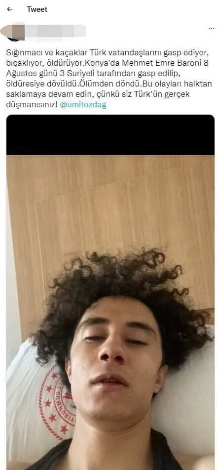 Bir firmada elektrik-elektronik mühendisi olarak çalışan Muhammed Beşir T., 12 Ağustos tarihinde sosyal medya hesabında bir fotoğraf paylaşarak, "Sığınmacı ve kaçaklar Türk vatandaşlarını gasp ediyor, bıçaklıyor, öldürüyor. Konya'da Mehmet Emre Baroni 8 Ağustos günü 3 Suriyeli tarafından gasp edilip, öldüresiye dövüldü, ölümden döndü. Bu alayları halktan saklamaya devam edin. Çünkü siz Türk'ün gerçek düşmanısınız" yazıp Zafer Partisi Genel Başkanı Ümit Özdağ'ı etiketledi.
