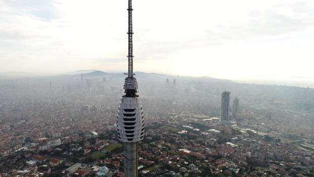 Çamlıca Kulesi’nin yapım aşamasında sona doğru gelindi. 365 metre yüksekliğe ulaşan kulenin restoran bölümünün üç parçası da monte edildi. Kulenin çevre düzenleme çalışmaları da devam ederken, kulede gelinen son durum havadan görüntülendi.