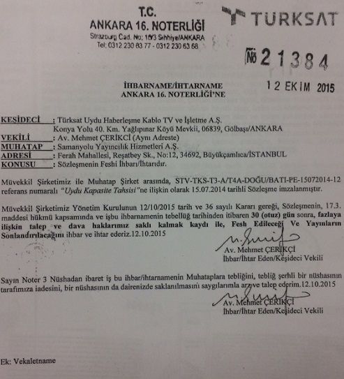 Samanyolu Yayın Grubu kanalları Türksat uydusundan da çıkarılıyor.