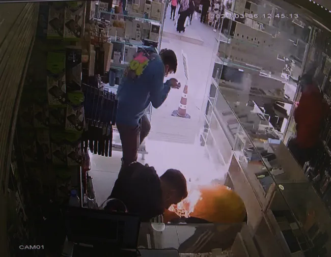 24 yıldır telefon tamir ettiğini ve bazen böyle olaylar yaşandığını anlatan işletme sahibi Paşa Kuyucu, "Müşterimizin getirdiği telefon bataryası şişmişti, 'yeni batarya taktırmak istiyorum, bataryam şişti' dedi. Biz de 'değiştirelim' dedik, daha telefonu söker sökmez, şişen batarya patladı, müşterimizin üzerine geldi. Çok şükür, bir şey olmadı, alev aldı ama müşterimiz hemen bir refleksle üzerindeki tişörtü çıkardı, alevlerin büyümesini engelledi ama korktuk tabi, büyük bir sesle patladı" dedi.