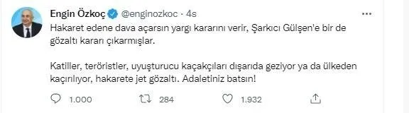 Özkoç resmi Twitter hesabından yaptığı paylaşımda Gülşen'e destek verip sahip çıkarak "Hakaret edene dava açarsın yargı kararını verir, Şarkıcı Gülşen'e bir de gözaltı kararı çıkarmışlar. Katiller, teröristler, uyuşturucu kaçakçıları dışarıda geziyor ya da ülkeden kaçırılıyor, hakarete jet gözaltı. Adaletiniz batsın!" ifadelerini kullandı.