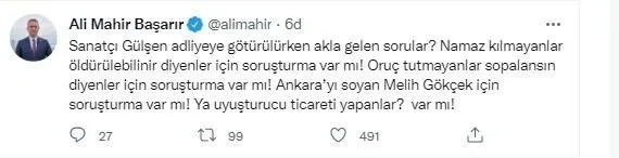 CHP Mersin Milletvekili Ali Mahir Başarır da şarkıcı Gülşen'e gözaltı kararı sonrası sahip çıkanlardan oldu. İmam Hatiplilere hakaret eden Gülşen'e hiç tepki göstermeyen Başarır sosyal medyadan desteğini şu şekilde dile getirdi: "Sanatçı Gülşen adliyeye götürülürken akla gelen sorular? Namaz kılmayanlar öldürülebilinir diyenler için soruşturma var mı! Oruç tutmayanlar sopalansın diyenler için soruşturma var mı! Ankara'yı soyan Melih Gökçek için soruşturma var mı! Ya uyuşturucu ticareti yapanlar? var mı!"
