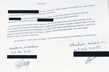 Mağdur Z.A. ile şüpheli U.G.Y.'nin anlaşmaya vardığı belirtilen protokolde "Z.A., savcılığa yaptığı şikayeti geri alacaktır, bu geri alma işlemi 01 Haziran 2018 tarihinde yapılacaktır. Şikayetten vazgeçme, U.G.Y. tarafından kabul edilecektir" ifadeleri yer aldı. 31 Mayıs 2018'de hazırlanan protokolde "Şikayetin geri alınmasından sonra, tarafların her ne ad altında olursa olsun birbirlerinden hiçbir hak ve alacak talebi bulunmamaktadır. Yine taraflar karşılıklı olarak vazgeçilen şikayetle ilgili herhangi bir hukuksal girişimde bulunmayacakların, savcılığa hiçbir başvuruda bulunmayacaklarını, vazgeçilen şikayetle ilgili bütün dava, talep, tazminat ve şikayet haklarından gayrikabil- i rücu ile feragat ettiklerini kabul ve beyan etmişlerdir" denildi.