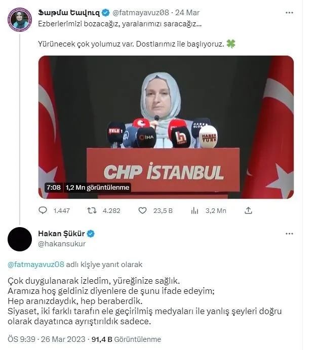 Diyanet’teki görevinden İslam’a aykırı söylemleri nedeniyle ihraç edilen, evlilik merasiminde alkol servis eden, LGBT savunuculuğu yaparak LGBT’liler için ‘başörtümü çıkarırım’ diyen Fatma Yavuz Korkmaz, CHP’den İstanbul Milletvekili Aday Adayı olduğunu sosyal medyadan açıkladı. “Dostlarımız ile başlıyoruz” mesajını paylaşan Korkmaz’ın helallik konuşmasına ve adaylığına ise FETÖ’cü Hakan Şükür’den iltifat geldi. Korkmaz da iltifatlar karşılığında Şükür’e hitaben “Çok teşekkürler Hakan Bey, az kaldı, ekmeğimize kan doğrayanlara inat, aşuremizi kaynatacağız, tadından yenmeyecek!” cümlesini yazdı.