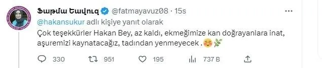 Korkmaz ise bu iltifatlar karşılığında Şükür'e hitaben "Çok teşekkürler Hakan Bey, az kaldı, ekmeğimize kan doğrayanlara inat, aşuremizi kaynatacağız, tadından yenmeyecek!" cümlelerini yazdı. Bu karşılıklı iltifatlar sosyal medyada da gündem oldu, çoğu sosyal medya kullanıcısı FETÖ'cü Hakan Şükür, CHP'li Fatma Yavuz Korkmaz hakkında tepkilerini dile getirdi.