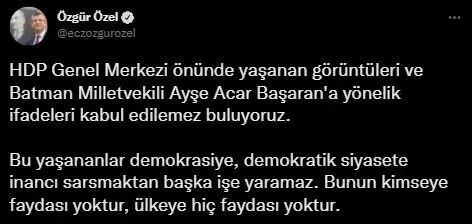 Özel paylaşımında şunları söyledi: "HDP Genel Merkezi önünde yaşanan görüntüleri ve Ayşe Acar Başaran'a yönelik ifadeleri kabul edilemez buluyoruz.