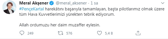 Milli Savunma Bakanlığı (MSB), Pençe-Kartal Operasyonu kapsamında Sincar, Karacak, Kandil, Zap, Avaşin, Basyan ve Hakurk'taki terör yuvalarına hava harekatı başlatmasının ardından ise tweet atan İP Genel Başkanı Meral Akşener, "Pençe-Kartal harekâtını başarıyla tamamlayan, başta pilotlarımız olmak üzere tüm Hava Kuvvetlerimizi yürekten tebrik ediyorum. Allah ordumuzu her daim muzaffer eylesin." şeklinde iki yüzlü ifadeler kullandı.