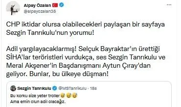 AK Parti İzmir Milletvekili Alpay Özalan, "CHP iktidar olursa olabilecekleri paylaşan bir sayfaya Sezgin Tanrıkulu'nun yorumu! Adil yargılayacaklarmış! Selçuk Bayraktar'ın ürettiği SİHA'lar teröristleri vurdukça, ses Sezgin Tanrıkulu ve Meral Akşener'in Başdanışmanı Aytun Çıray'dan geliyor. Bunlar, bu ülkeye düşman!" diyerek Sezgin Tanrıkulu'na tepki gösterdi.