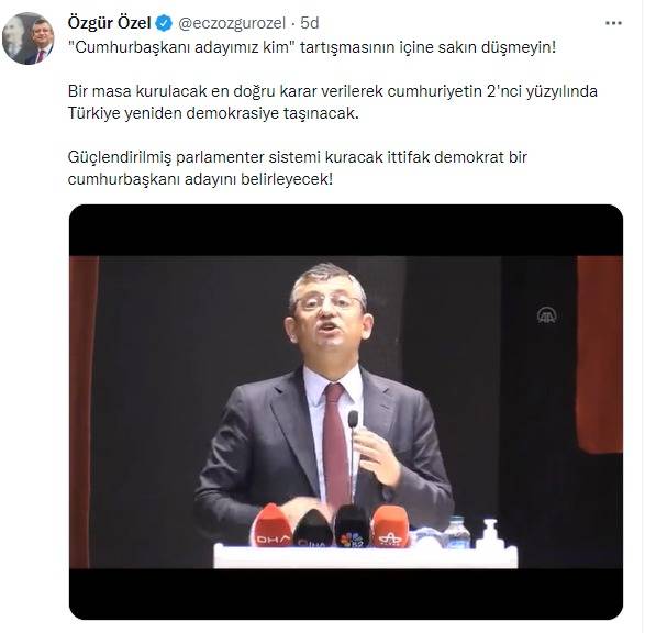 Zillet ittifakının Cumhurbaşkanı adayını belirleyemediği ve konunun tartışma boyutuna geldiğini itiraf eder nitelikte sosyal medya hesabı üzerinden paylaşım yapan CHP Grup Başkanvekili Özgür Özel, “Cumhurbaşkanı adayımız kim’ tartışmasının içine sakın düşmeyin! Bir masa kurulacak en doğru karar verilerek cumhuriyetin 2'nci yüzyılında Türkiye yeniden demokrasiye taşınacak. Güçlendirilmiş parlamenter sistemi kuracak ittifak demokrat bir cumhurbaşkanı adayını belirleyecek!” ifadelerini kullandı.