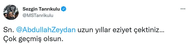 CHP İstanbul Milletvekili Sezgin Tanrıkulu, Türkiye'ye yönelik söylediği "PKK sizi tükürüğüyle boğar" sözü ile bilinen ve cezaevinden tahliye olan HDP'li Abdullah Zeydan'a geçmiş olsun dileklerini iletti. Tanrıkulu, "Uzun yıllar eziyet çektiniz." dedi.