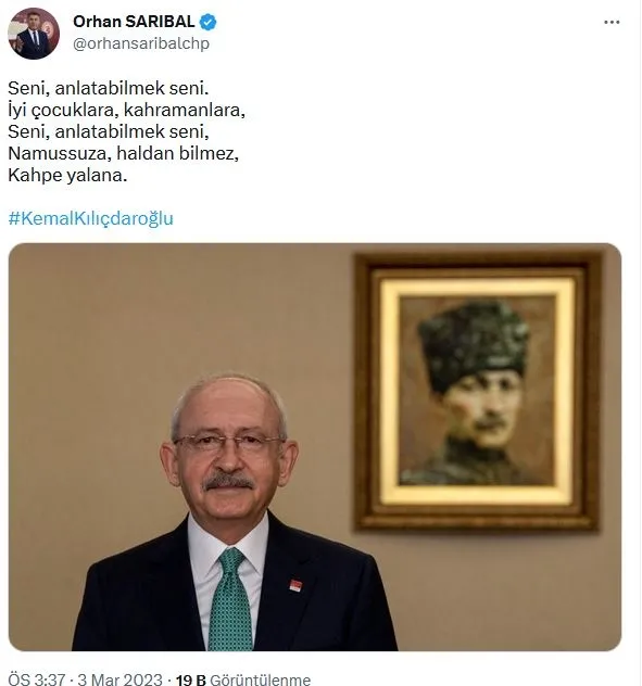 Orhan Sarıbal, sosyal medya hesabından Kılıçdaroğlu'nun fotoğrafını paylaşarak İYİ Parti'ye çok ağır sözlerle yüklendi. Sarıbal, paylaşımında "Seni, anlatabilmek seni. İyi çocuklara, kahramanlara, Seni, anlatabilmek seni, Namussuza, haldan bilmez, Kahpe yalana." ifadelerine yer verdi.