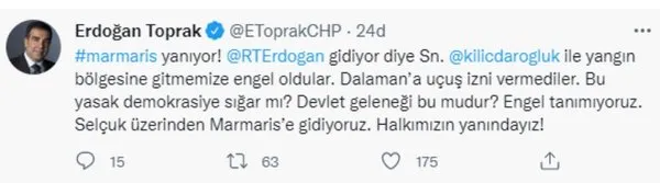 Toprak, "Marmaris yanıyor! Recep Tayyip Erdoğan gidiyor diye Sayın Kemal Kılıçdaroğlu'nun ile yangın bölgesine gitmemize engel oldular. Dalaman'a uçuş izni vermediler. Bu yasak demokrasiye sığar mı? Devlet geleneği bu mudur? Engel tanımıyoruz. Selçuk üzerinden Marmaris'e gidiyoruz. Halkımızın yanındayız!" iddiasında bulundu.