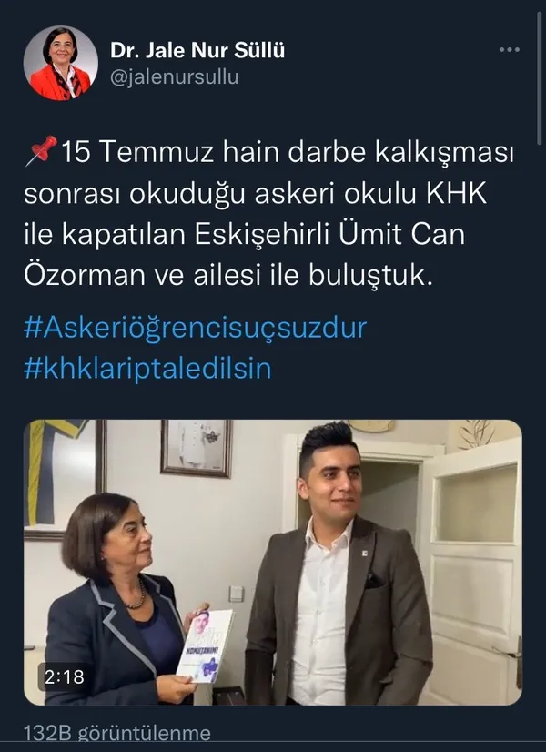 CHP Eskişehir Milletvekili Jale Nur Süllü mağdur diye 'MS'im komutanım' isimli kitabın yazarı Ümit Can Özorman (26) isimli eski askeri okul öğrencisini ziyaret etti. 15 Temmuz hain darbe girişi sonrası Karamürselbey Eğitim Merkezi Komutanlığı'ndan KHK ile atılan Özorman ile bir araya gelen Süllü, eski askeri okul öğrencisini mağdur gibi gösterdi.