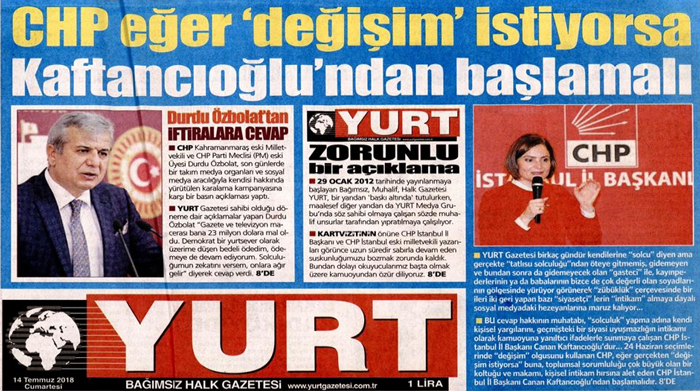 CHP Kahramanmaraş eski Milletvekili Durdu Özbolat’ın kurucu başkanı olduğu Yurt Gazetesi, skandallarıyla ünlü CHP İstanbul İl Başkanı Canan Kaftancıoğlu ile birbirine girdi. Bir süredir Kaftancıoğlu ile polemik yaşayan gazete yönetimi ve Özbolat, bugünkü baskıda CHP İstanbul İl Başkanına sert sözlerle yüklendiler. Gazetenin ilk sayfasında Kaftancıoğlu’na yönelik bir yazıda, il başkanının “zübüklük çerçevesinde” hareket ettiği ifadesi, en dikkat çekici ayrıntı oldu.