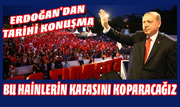 Cumhurbaşkanı Erdoğan, "15 Temmuz ilk değil son saldırı da olmayacaktır. FETÖ'nün, PKK'nın, DEAŞ'ın arkasında kimlerin olduğunu biliyoruz. Önce bu hainlerin kafasını kopartacağız." ifadelerini kullandı.