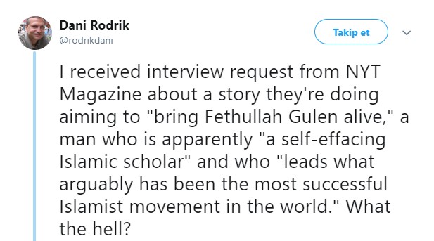 Dani Rodrik Twitter’dan yaptığı paylaşımında, kendisine Amerikan New York Times’tan bir röportaj talebi geldiğini ve talepte bulunanların Fetullah Gülen hakkında bir haber hazırladıklarını belirtti. Muhabirlerin Fetullah Gülen’i nasıl tanımladığı ise tamamen skandal...