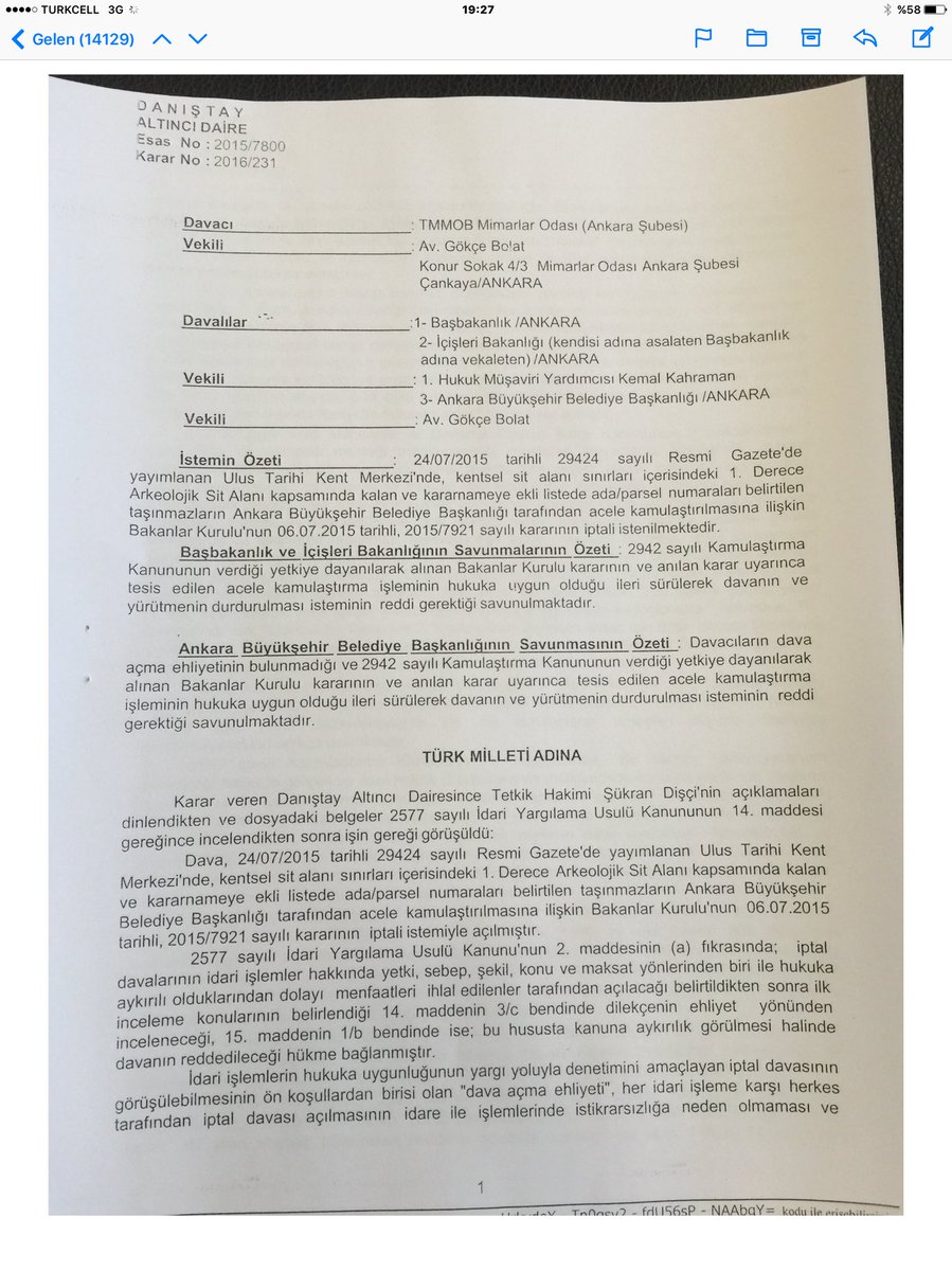 Ancak, vatandaşların açtığı davada acele kamulaştırma kararlarına yürütmeyi durdurma kararı verildi. Mimarlar Odası Ankara Şube Başkanı Tezcan Karakuş Candan, “Mahkeme kararında karşı oylar var, dava temyize gidecek” dedi.