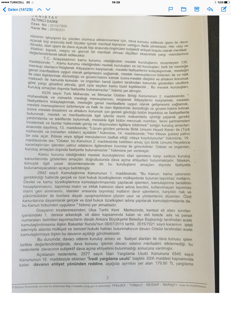 Danıştay 6. Dairesi Mimarlar Odası Ankara Şubesi’nin menfaatinin etkilenmediği gerekçesiyle davayı ehliyetten reddetti.
