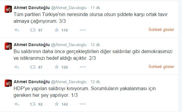 Davutoğlu, ‘HDP’ye yapılan saldırıyı kınıyorum. Sorumluların yakalanması için her şey yapılıyor. Bu saldırının daha önce gerçekleştirilen saldırılar gibi demokrasimizi ve istikrarımızı hedef aldığı açıktır. Tüm partileri Türkiye’nin neresinde olursa olsun ortak tavır almaya çağırıyorum’ dedi.