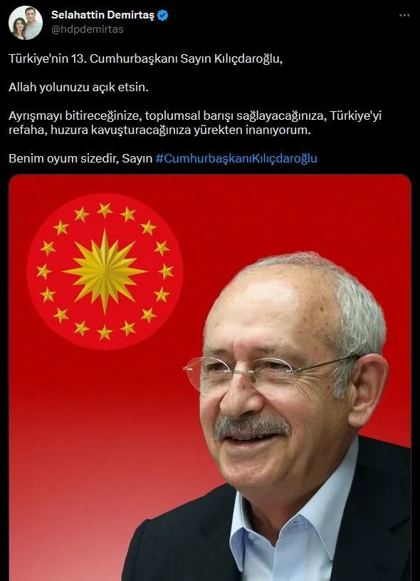 Sosyal medya hesabından açıklama yapan Demirtaş, Kılıçdaroğlu'nu şimdiden Cumhurbaşkanı ilan etti ve "Allah yolunuzu açık etsin. Ayrışmayı bitireceğinize, toplumsal barışı sağlayacağınıza, Türkiye'yi refaha, huzura kavuşturacağınıza yürekten inanıyorum" dedi.