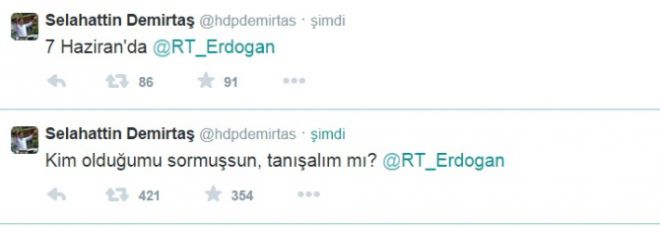 Selahattin Demirtaş, Erdoğan’ın Türkiye İhracatçılar Meclisi üyelerine yaptığı konuşmada HDP’ye yönelik, ‘’Yav siz kendinizi ne sanıyorsunuz’’ sözlerine, ‘’Kim olduğumu sormuşsun, tanışalım mı? 7 Haziran’da’’ ifadeleriyle yanıt verdi.