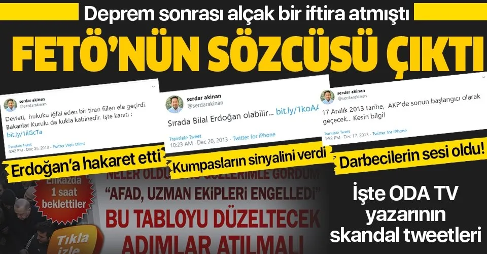 Deprem üzerinden algı operasyonu yapan Serdar Akinan, FETÖ’nün eylemlerine açık destek vermiş
