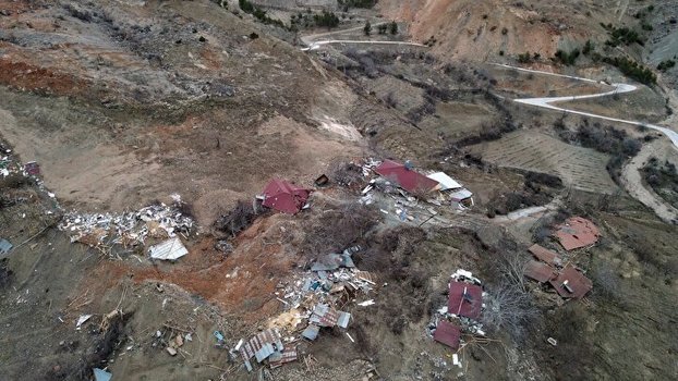 Malatya'nın Doğanşehir ilçesinde, Kahramanmaraş'ın Pazarcık ilçesi merkezli 7,7 büyüklüğündeki ilk depremin ardından meydana gelen heyelan nedeniyle 500 metre aşağıya kayarak tamamen yıkılan 15 haneli mezra havadan görüntülendi.