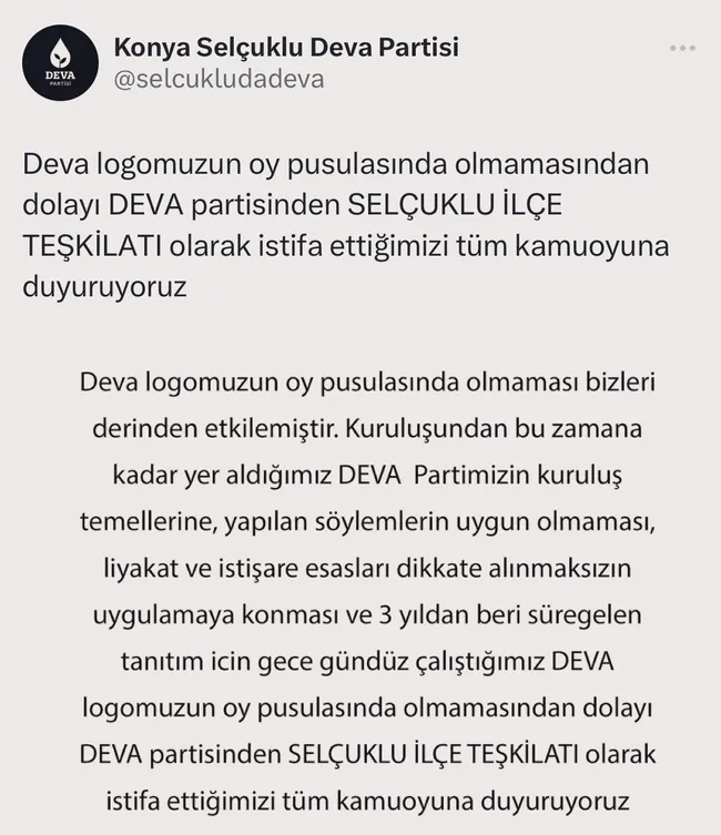 DEVA Partisi'nin Konya'da bulunan Selçuklu İlçe Teşkilatı kendi logoları altında seçime girmeme kararına tepki göstererek istifa etti.