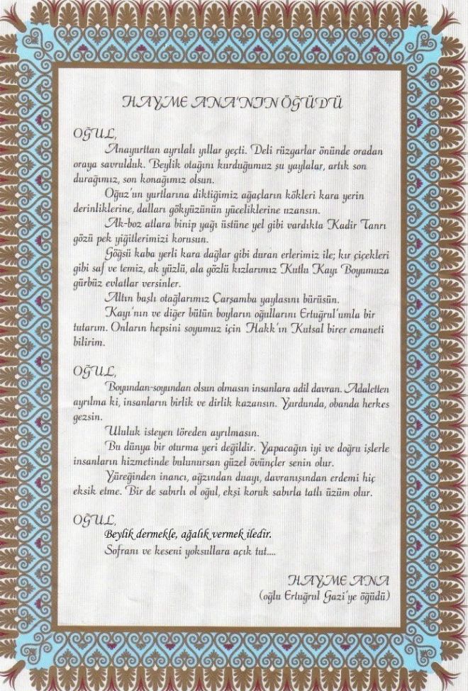 ''Oğul... Anayurttan ayrılalı yıllar geçti. Deli rüzgarlar önünde oradan oraya savrulduk. Beylik otağını kurduğumuz şu yaylalar, artık son durağımız, son konağımız olsun. Oğuz'un yurtlarına diktiğimiz ağaçların kökleri kara yerin derinliklerine, dalları gökyüzünün yüceliklerine uzansın. Ak-boz atlara binip yağı üstüne yel gibi vardıkta Kadir Tanrı gözü pek yiğitlerimizi korusun. Göğsü kaba yerli kara dağlar gibi duran erlerimiz ile kır çiçekleri gibi saf ve temiz, ak yüzlü, ala gözlü kızlarımız kutlu Kayı Boyumuza gürbüz evlatlar versinler. Altın başlı otağlarımız Çarşamba yaylasını bürüsün. Kayı'nın ve diğer bütün boyların oğullarını Ertuğrul'umla bir tutarım. Onların hepsini soyumuz için Hakk'ın kutsal birer emaneti bilirim. Oğul... Boyundan, soyundan olsun olmasın insanlara adil davran. Adaletten ayrılma ki, insanların birlik ve dirlik kazansın. Yurdunda, obanda herkes gezsin. Ululuk isteyen töreden ayrılmasın. Bu dünya bir oturma yeri değildir. Yapacağın iyi ve doğru işlerle insanların hizmetinde bulunursan güzel övünçler senin olur. Yüreğinden inancı, ağzından duayı, davranışından erdemi hiç eksik etme. Bir de sabırlı ol oğul, ekşi koruk sabırla tatlı üzüm olur. Oğul... Beylik dermekle, ağalık vermek iledir. Sofranı ve keseni yoksullara açık tut.''