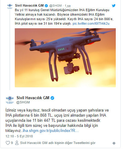 SHGM’den yapılan açıklamada izinsiz İHA uçurmanın da ciddi miktarlarda para cezasıyla cezalandırılacağı belirtilerek, “İzinsiz veya kayıtsız, tescil olmadan uçuş yapan şahıslara ve İHA pilotlarına 6 bin 868 TL, uçuş izni almadan yapılan İHA uçuşlarında ise 11 bin 447 TL para cezası kesilmektedir. İHA ile ilgili tüm süreç ve başvurular hakkında bilgi için tıklayınız” denildi.