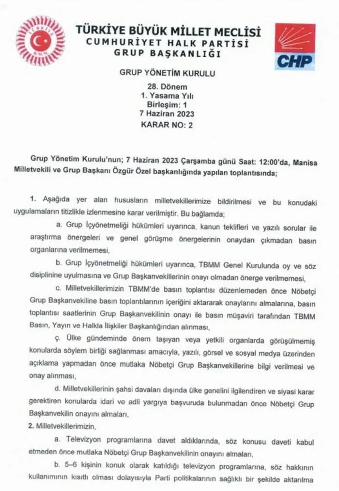 Alınan kararda, "Grup Yönetim Kurulu'nun 7 Haziran 2023 Çarşamba günü saat 12.00'de, Manisa Milletvekili ve Grup Başkanı Özgür Özel Başkanlığı'nda yapılan toplantısında; aşağıda yer alan hususların milletvekillerimize bildirilmesi ve bu konudaki uygulamaların titizlikle izlenmesine karar verilmiştir." denildi.3 MADDE ÖN PLANA ÇIKTI