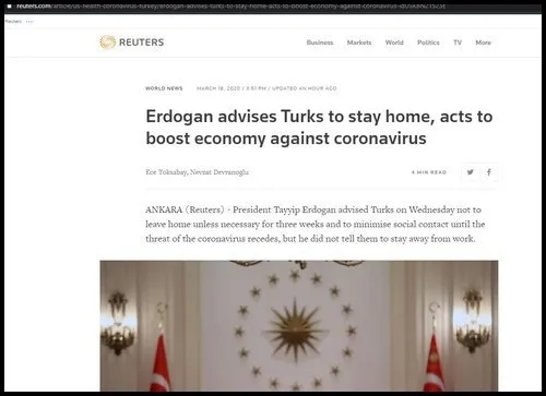 Reuters haber ajansının 'Başkan Erdoğan koronavirüse karşı ekonomiyi canlandırmak için harekete geçiyor' başlıklı haberinde, Türkiye Merkez Bankası'nın planlanandan daha erken bir toplantı ile koronavirüsün etkilerine anında müdahale ettiğinin altı çizilerek piyasayı desteklemek için adımlar attığı bildirildi.