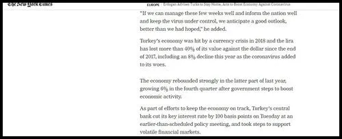 Türkiye'nin 2017 ve 2018'de yaşadığı dolar kuru saldırılarının ardından geçtiğimiz yılın son çeyreğinde yüzde 6'lık bir büyüme gerçekleştirdiğini yazan aralarında Reuters ve New York Times'ın da bulunduğu yabancı medya kuruluşları Türkiye'nin koronavirüse karşı aldığı ekonomik önlemlerden övgüyle söz etti.