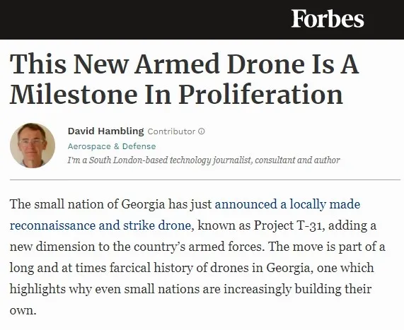 ABD dergisi Forbes, yayınladığı son analizde Gürcistan'ın İHA üretiminde Türkiye'yi örnek aldığına yer verdi. Forbes, 2019 yılında keşif ve saldırı amaçlı insansız hava aracı geliştirme projesi T-31'i duyuran Gürcistan'ın Türk İHA/SİHA teknolojisini kullanacağını duyurdu.
