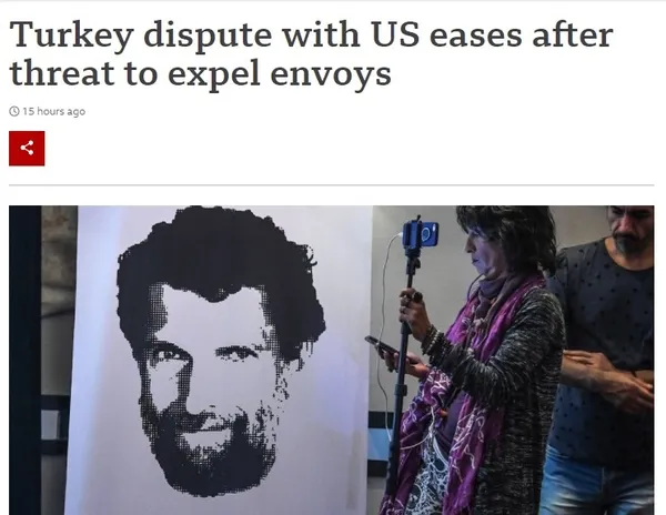 BBC, haberinde ""Türkiye ile ABD dahil 10 Batılı ülke arasındaki gerilim, Cumhurbaşkanı Recep Tayyip Erdoğan'ın büyükelçileri 'istenmeyen adam' ilan edeceğini duyurmasından sonra azaldı." ifadelerini kullandı.