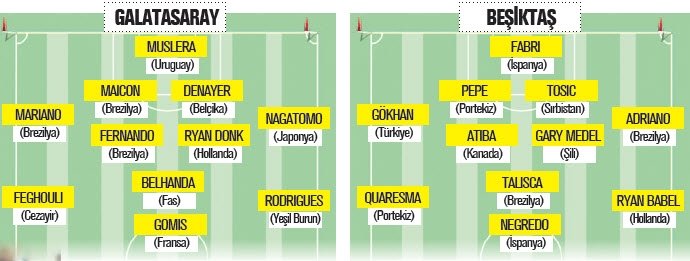 Pazar günü TT Stadı'nda oynanacak dev derbi farklı bir özelliği ile dikkatleri çekiyor... Bu önemli 90 dakikaya Galatasaray 11, Beşiktaş ise 10 yabancı ile çıkacak. Sahada 5 Brezilyalı, 2 Hollandalı, 2 Portekizli, 2 İspanyol, 1 Uruguaylı, 1 Belçikalı, 1 Japon, 1 Faslı, 1 Cezayirli, 1 Fransız, 1 Yeşil Burun Adalı, 1 Kanadalı, 1 Sırp ve 1 Şilili olacak. Müthiş maçın 11'inde tek Türk olarak Gökhah Gönül mücadele edecek.