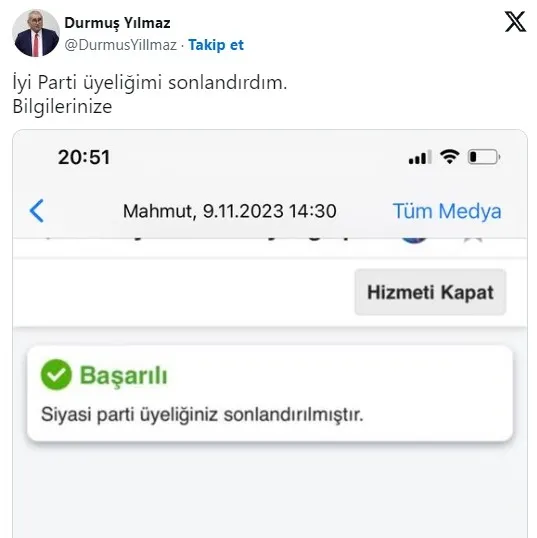 İYİ Partili Durmuş Yılmaz, sosyal medyadan yaptığı paylaşımda istifa ettiğini açıkladı. Yılmaz, açıklamasında partiden istifa ettiğini gösteren ekran görüntüsünü de paylaştı.