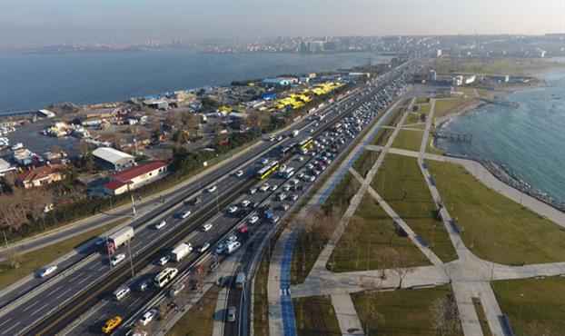 Küçükçekmece E-5 yanyolu üzerinde elektrik hatlarında yapılan çalışmalar yüzünden oluşan trafik, havadan drone ile görüntülendi. Kilometrelerce uzayan araç trafiğinin ara sokaklara kadar ilerlediği görüldü.