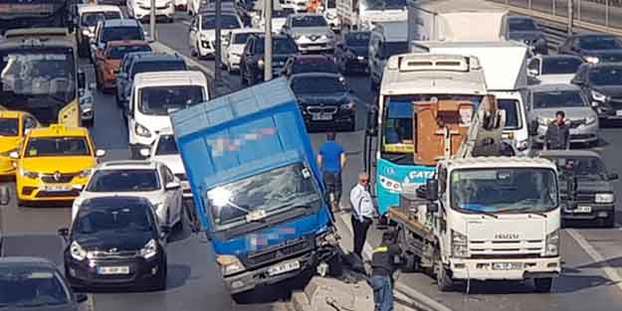 E-5 karayolu Yenibosna mevki'inde bir kargo firmasına ait kamyonet orta refüjde bulunan aydınlatma direğine çarptı. Devrilen direğin diğer araçlara çarpmaması faciayı önledi. E-5 Bakırköy istikametinde trafik durma noktasına geldi.